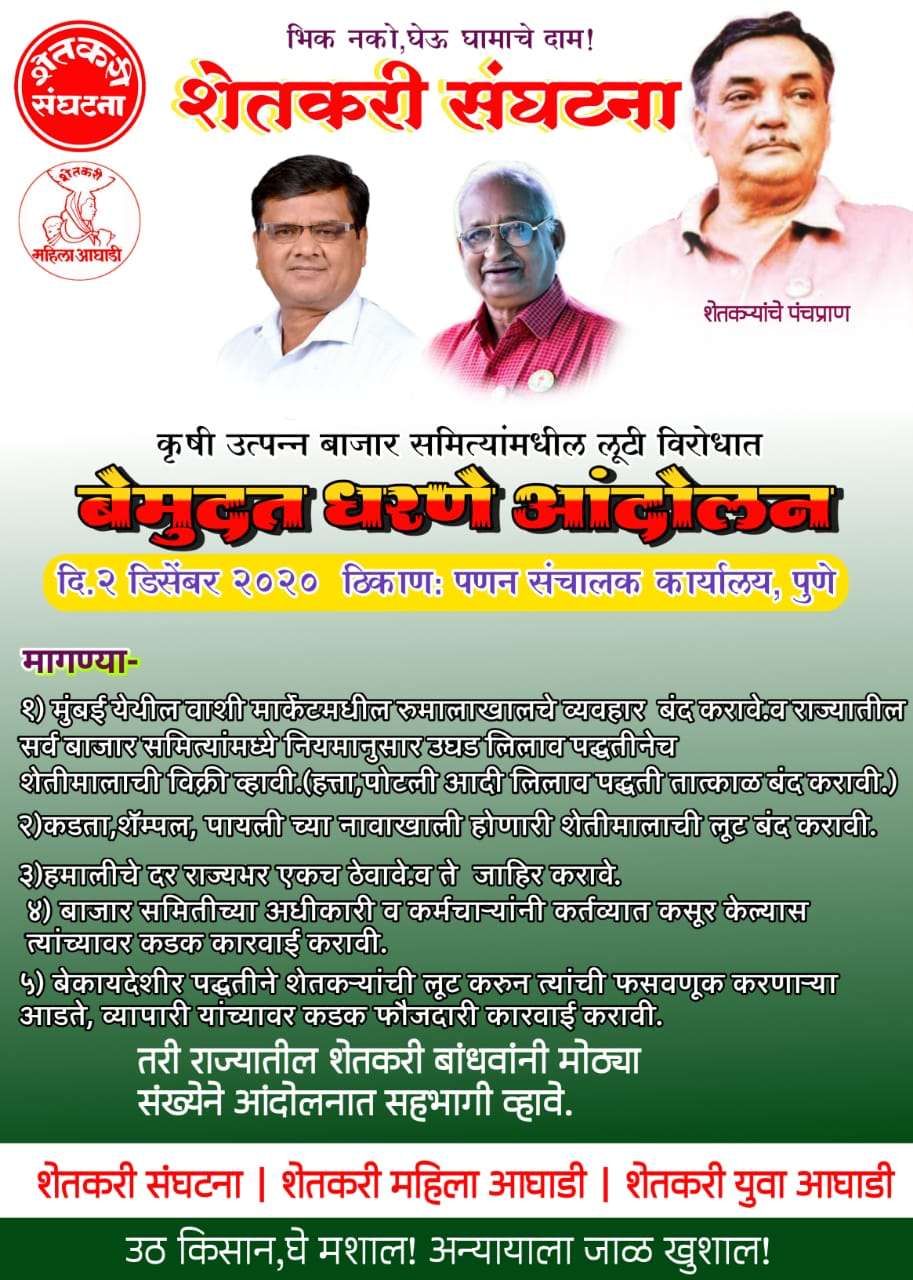 दि. २ डिसेंबर २०२० पासून पुणे येथील पणन संचालक कार्यालया समोर बेमुदत धरणे आंदोलन करण्यात येणार आहे. रोज सकाळी ११ ते सायंकाळी ५ वाजे पर्यंत आंदोलन सुरू राहील. ज्या शेतकर्यांची लूट झाली आहे त्यांनी आंदोलनात सहभागी होऊन आपली तक्रार नोंदवायची आहे. शेतकरी ते ग्राहक अशी संरचना उभी करू इच्छीणार्या उद्योजकांनी सुद्धा आंदोलनात सहभागी व्हावे अशी अपेक्षा आहे. महाराष्ट्रातील अनेक जिल्ह्यातून शेतकरी आंदोलनात सहभागी होण्यसाठी येणार आहेत. स्वतंतत्रतावादी विचाराच्या संघटना व पक्षांनी या आंदोलनास पाठिंबा जाहीर करून आंदोलनात भाग घ्यावा. खुल्या व्यवस्थेचे समर्थक व अभ्यासकांनी धरणे आंदोलन स्थळी आपले विचार मांडावेत अशी शेतकरी संघटनेची अपेक्षा आहे.