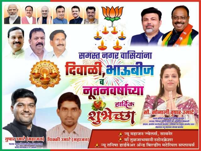 या पवित्र सणानिमित्ताने सावनेर येथील सर्व नागरिकांना व व्यापाऱ्यांना उमाटे(महाजन) कुटुंबाच्यावतीने दिवाळी,भाऊबीज व नवीन वर्षाच्या मन:पूर्वक शुभेच्छा देण्यात येत आहेत: